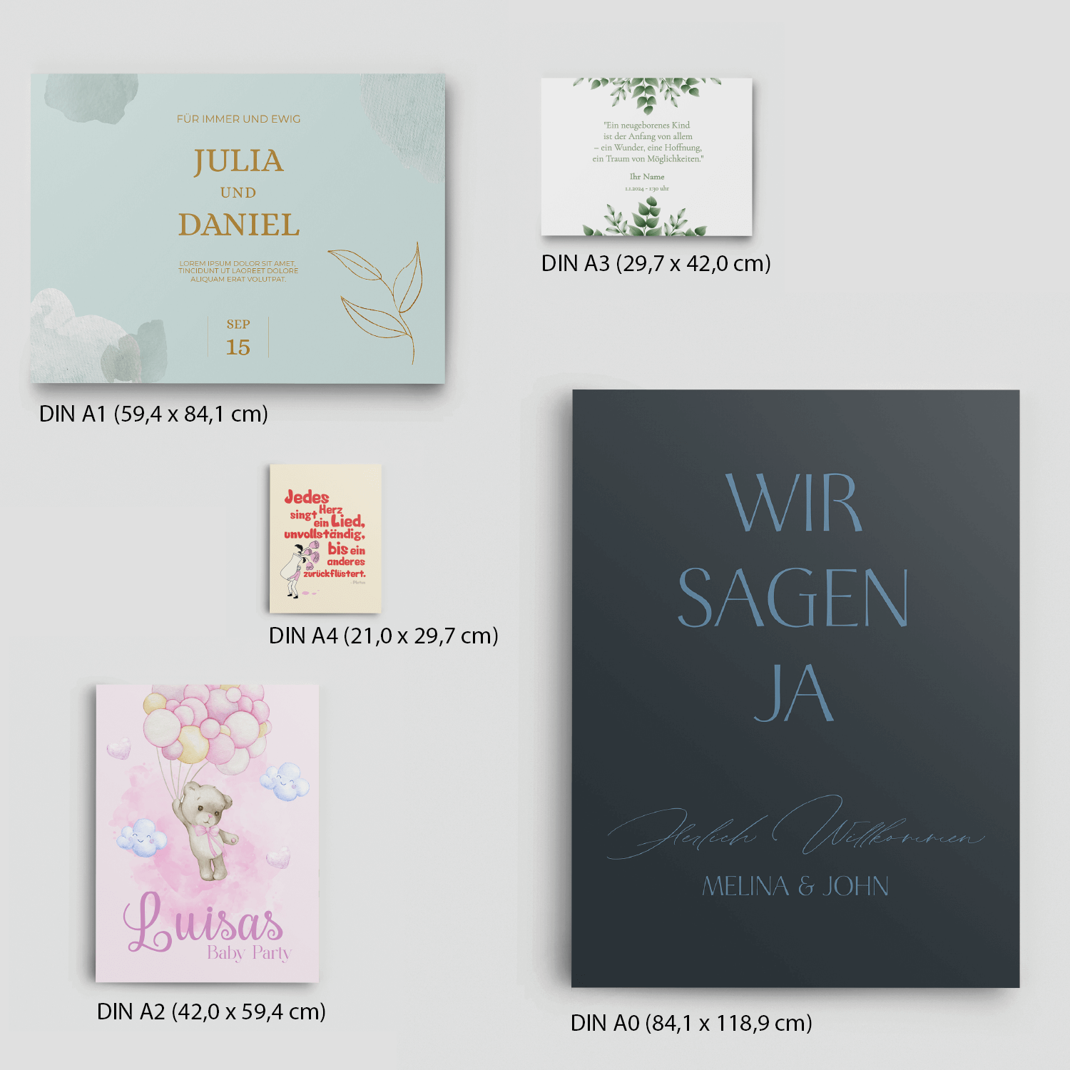 Unsere Willkommensschilder gibt es in verschiedenen DIN-Größen, damit du die perfekte Dimension für dein Event findest. Wähle zwischen DIN A4 (21,0 x 29,7 cm), DIN A3 (29,7 x 42,0 cm), DIN A2 (42,0 x 59,4 cm), DIN A1 (59,4 x 84,1 cm) oder DIN A0 (84,1 x 118,9 cm) – von kompakt bis XXL ist alles möglich.
