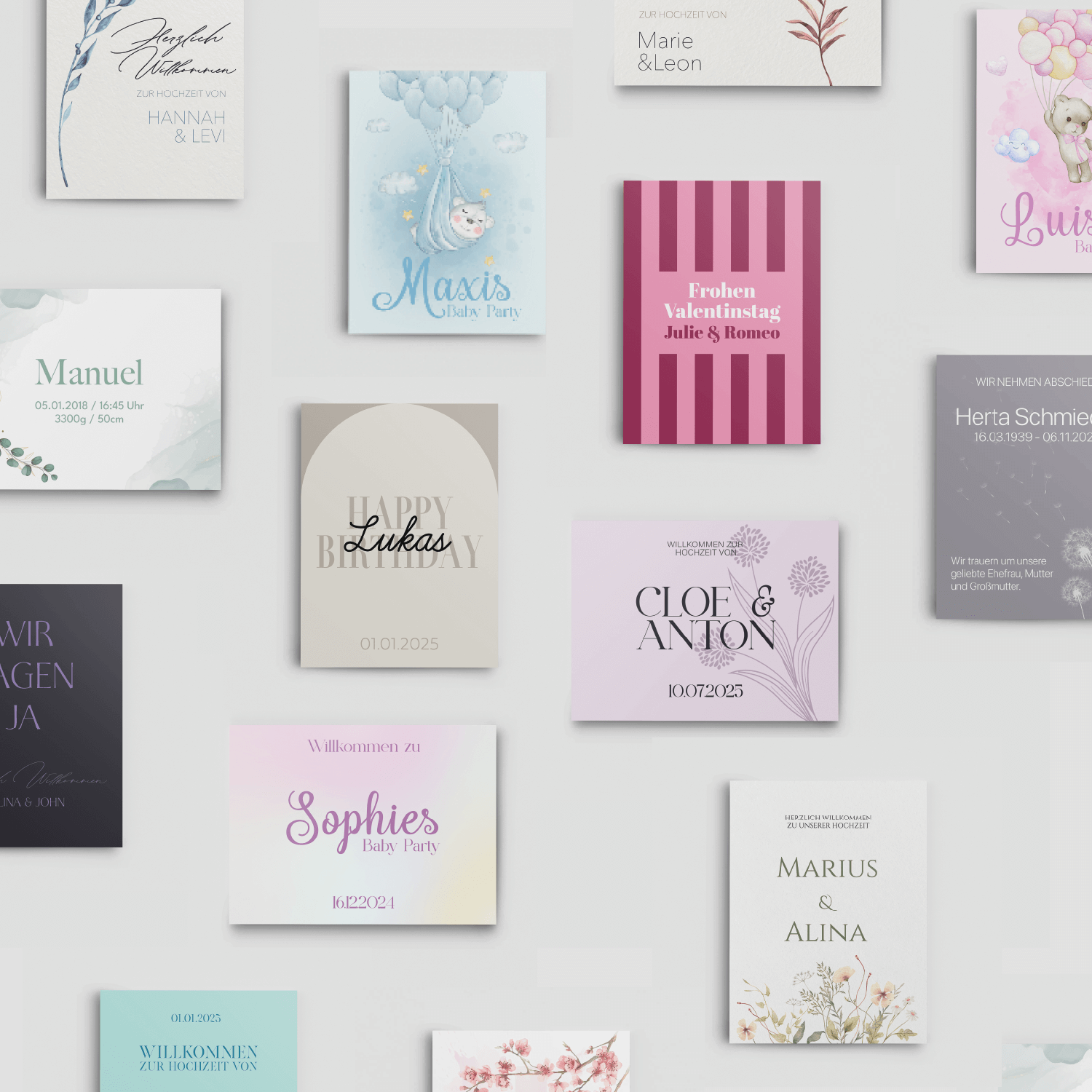 So einfach geht's: Wähle dein Lieblingsdesign, füge Namen und Datum hinzu und mache deine Veranstaltung zu etwas Besonderem. Jedes Welcome-Schild wird individuell für dich angefertigt und schafft den perfekten ersten Eindruck.
